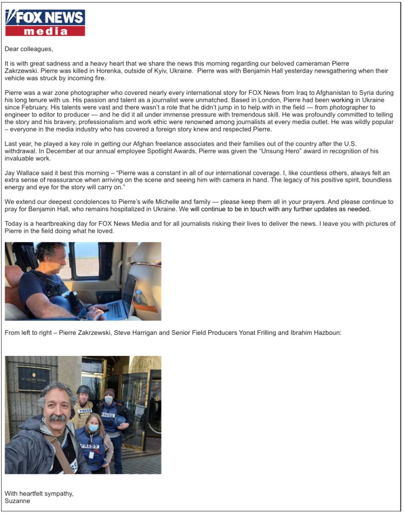 Ο Pierre Zakrzewski συνόδευε τον δημοσιογράφο Benjamin Hall, ο οποίος τραυματίστηκε όταν το όχημά τους δέχθηκε πυρά στη Χορένκα, κοντά στο Κίεβο, ανέφερε σε ανακοίνωσή της η διευθύνουσα σύμβουλος του Fox News Media, Suzanne Scott.