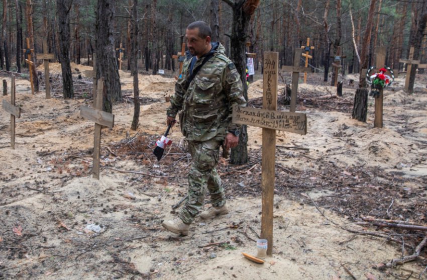 Στην κατεστραμμένη από τις μάχες Μπούτσα, πτώματα αμάχων που έχουν εκτελεστεί εν ψυχρώ κείτονται στους δρόμους. Τα άψυχα σώματα εκατοντάδων αμάχων, ορισμένα με σημάδια βασανιστηρίων, βρίσκονται σε ομαδικούς τάφους στην μικρή αυτή πόλη της περιφέρειας του Κιέβου.