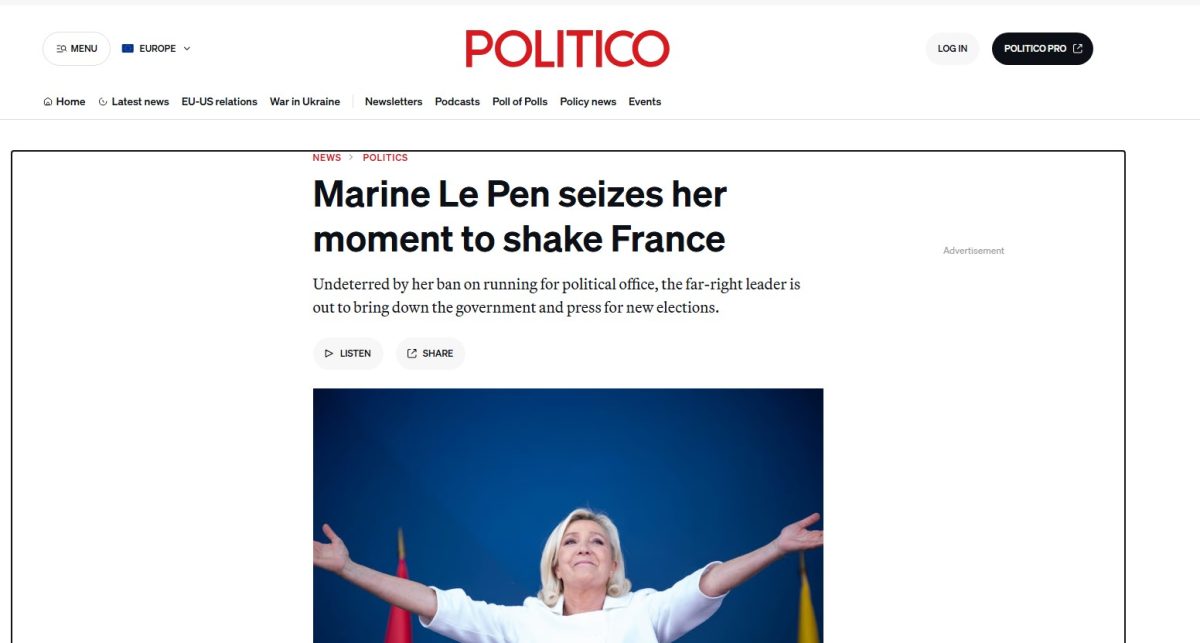 Politico: Η Λεπέν εκμεταλλεύεται την πολιτική κρίση στη Γαλλία – Ζητά πρόωρες εκλογές