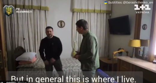 O πρόεδρος της Ουκρανίας Βολοντίμιρ Ζελένσκι ξενάγησε τον Ουκρανό δημοσιογράφο Ντμίτρο Κομαρόβ στο σπίτι του, που στην ουσία είναι ένας χώρος στο γραφείο του και μέσα σ' αυτό ζει τον τελευταίο χρόνο, όσο διαρκεί η εισβολή της Ρωσίας στην Ουκρανία: «Αυτό είναι το σπίτι μου» λέει.