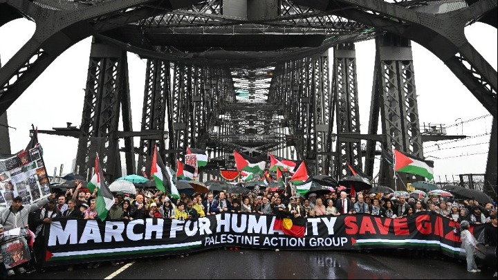 Χιλιάδες διαδηλωτές αψήφησαν την καταρρακτώδη βροχή και διαμαρτυρήθηκαν σήμερα, διασχίζοντας την εμβληματική γέφυρα Harbour Bridge στο Σίδνεϊ, καλώντας για την ειρήνη και τη διανομή ανθρωπιστικής βοήθειας στην καταστραμμένη από τον πόλεμο, Λωρίδα της Γάζας, όπου και επιδεινώνεται η ανθρωπιστική κρίση.