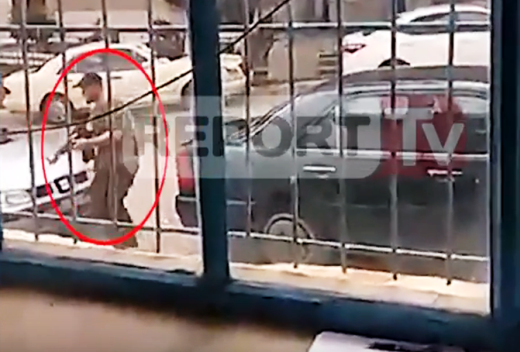 Ο 35χρονος ομογενής εμφανίζεται στο βίντεο έξω από καφενείο, απ’ όπου ένας θαμώνας τον καταγράφει με το όπλο στα χέρια να τρέχει και να καλύπτεται πίσω από αυτοκίνητα, προφανώς απέναντί του βρίσκονταν Αλβανοί αστυνομικοί.