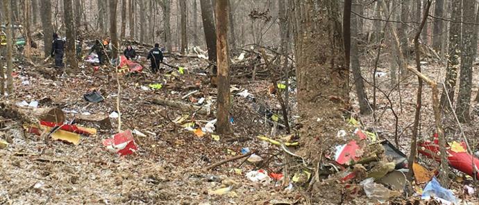 Τα συντρίμμια του μοιραίου ελικοπτέρου εντοπίστηκαν σε δύσβατη περιοχή. Έρευνα για τα αίτια της τραγωδίας διεξάγει η Εθνική Υπηρεσία για την Ασφάλεια των Αερομεταφορών (NTSB).