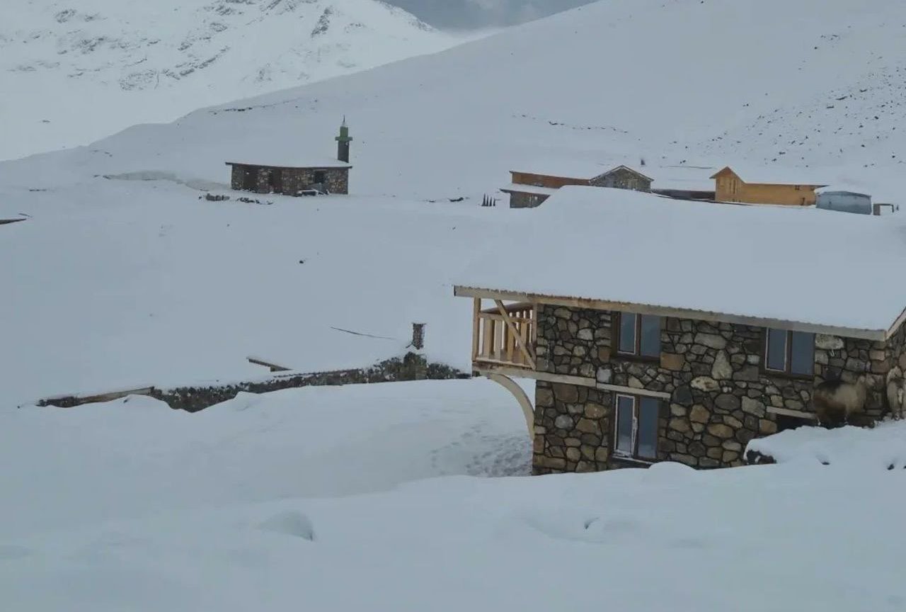 Πλάνα που μετέδωσε από τη Ριζούντα το πρακτορείο ειδήσεων DHA δείχνουν μία πέτρινη κατοικία να έχει καλυφθεί από περισσότερα από 10 εκατοστά χιόνι.