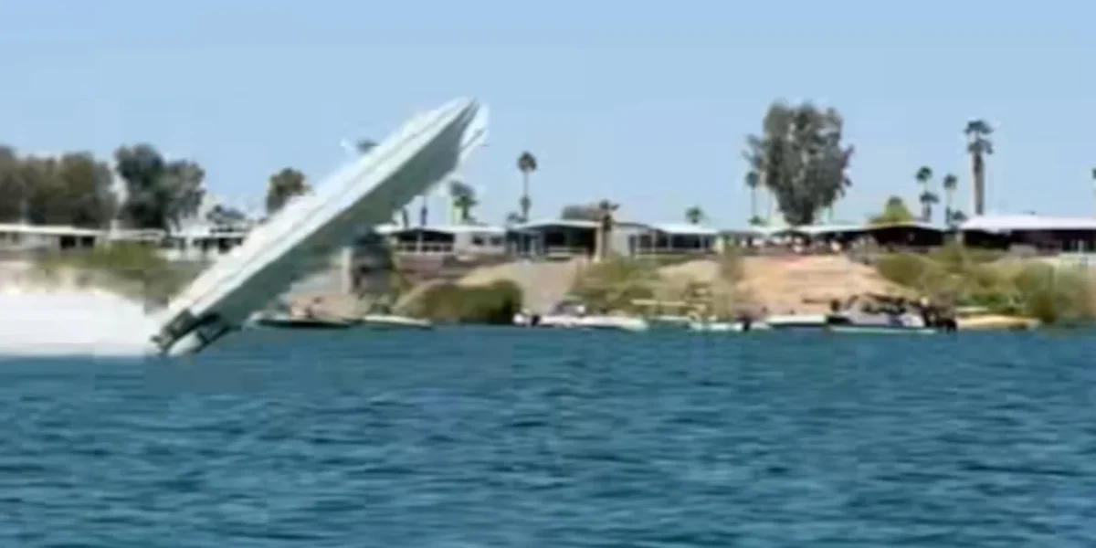 Speedboat driving 200mph flips up in the air and crash as the drivers attempt to break a record in Lake Havasu, Arizona.