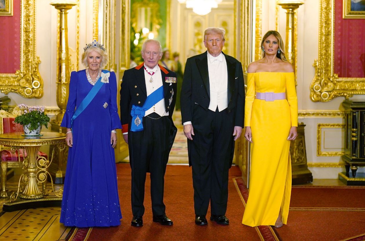 Στο Κάστρο του Ουίνδσορ, το βράδυ της Τετάρτης, παρουσία περίπου 150 προσκεκλημένων, μεταξύ των οποίων ο πρίγκιπας και η πριγκίπισσα της Ουαλίας, επιχειρηματίες όπως ο Τιμ Κουκ και ο Ρούπερτ Μέρντοχ, καθώς και ανώτατοι αξιωματούχοι από το Ηνωμένο Βασίλειο και τις ΗΠΑ, το βασιλικό ζεύγος της Βρετανίας υποδέχθηκε την απαστράπτουσα, μέσα στο κίτρινο, «off shoulder» φόρεμά της, και μία λιλά ζώνη στη μέση, Μελάνια, και τον Ντόναλντ Τραμπ.