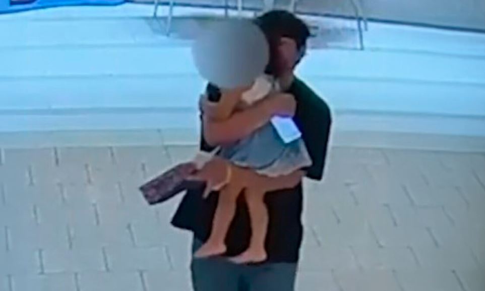 Στο σοκαριστικό βίντεο που έδωσε στη δημοσιότητα του γραφείο του Σερίφη της Κομητείας Φέρφαξ, και το οποίο καταγράφηκε από κάμερες ασφαλείας στις 18 Ιουλίου, ο 26χρονος Andres Caceres Jaldin εμφανίζεται να σηκώνει στα χέρια του τη μικρή και να περπατάει κρατώντας τη στην αγκαλιά του.