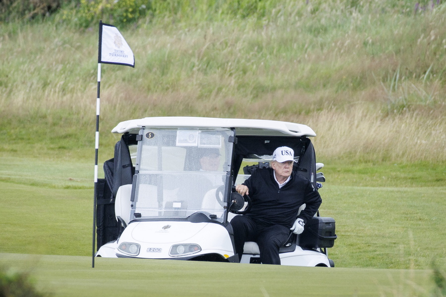 Εκατοντάδες άνθρωποι διαδηλώνουν σήμερα στο Εδιμβούργο και το Άμπερντιν στη Σκωτία για να διαμαρτυρηθούν για την επίσκεψη του Ντόναλντ Τραμπ, που επιδίδεται στο αγαπημένο του άθλημα, το γκολφ, στο γήπεδό του στο Τέρνμπερι, το οποίο βρίσκεται υπό ισχυρή αστυνομική προστασία.