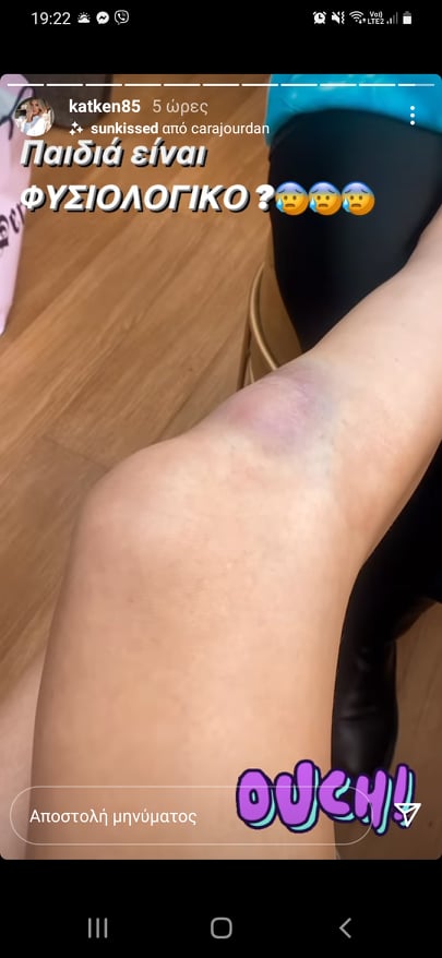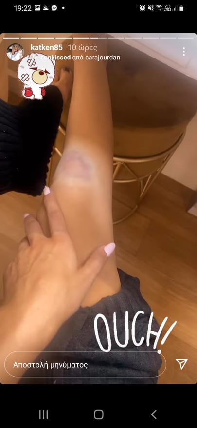 «Καλημέρα από το καμαρίνι. Η μέρα ξεκινά πολύ περίεργα. Κοιτάξτε τι έπαθα χθες βράδυ. Δεν καταλαβαίνετε. Έπεσα, γλίστρησα, διαλύθηκα. Όλα λάθος», ανέφερε χαρακτηριστικά η Κατερίνα Καινούργιου, ενώ έδειξε και το πρησμένο, γεμάτο μελανιές, πόδι της.