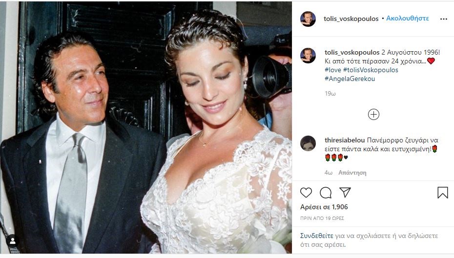 Συγκεκριμένα ανέβασε μια φωτογραφία από την ημέρα του γάμου τους στην Κέρκυρα και τη συνόδευσε με το εξής σχόλιο: «2 Αυγούστου 1996! Κι από τότε πέρασαν 24 χρόνια», ενώ δίπλα έβαλε μια κόκκινη καρδιά.