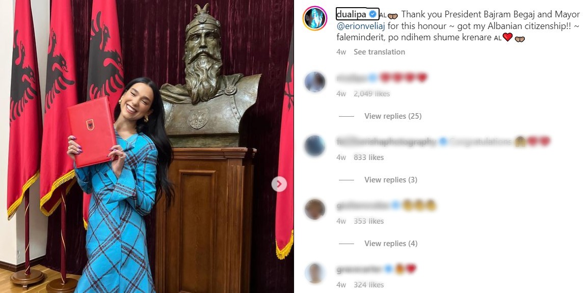 Ο Πρόεδρος της Αλβανίας δήλωσε ότι είναι τιμή του που έδωσε ο ίδιος την υπηκοότητα στην ποπ σταρ καθώς η Lipa «έκανε τους Αλβανούς διάσημους σε όλο τον κόσμο». «Θα είμαι Αλβανίδα και με χαρτιά», είπε η Lipa από το δημαρχείο των Τιράνων.