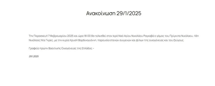 «Την Παρασκευή 7 Φεβρουαρίου 2025 και ώρα 18:00 θα τελεσθεί στον Ιερό Ναό Αγίου Νικολάου Ραγκαβά ο γάμος του Πρίγκιπα Νικόλαου, ήδη Νικόλαος Ντε Γκρες, με την κυρία Χρυσή Βαρδινογιάννη, παρουσία στενών συγγενών και φίλων της οικογένειας και του ζεύγους. Γραφείο πρώην Βασιλικής Οικογένειας της Ελλάδος».