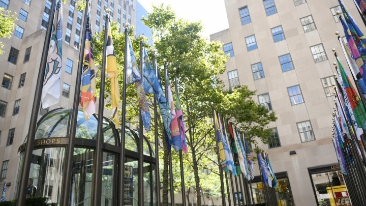 Το εμβληματικό Ροκφέλερ Σέντερ της Νέας Υόρκης μετατρέπεται έως τις 16 Αυγούστου σε υπαίθρια γκαλερί, καθώς γύρω από τη βυθισμένη πλατεία έχουν τοποθετηθεί 192 σημαίες που σχεδίασαν ερασιτέχνες καλλιτέχνες του Πράσινου Μήλου, αλλά και βαριά ονόματα στην παγκόσμια αγορά τέχνης όπως οι Τζεφ Κουνς, Μαρίνα Αμπράμοβιτς και άλλοι.