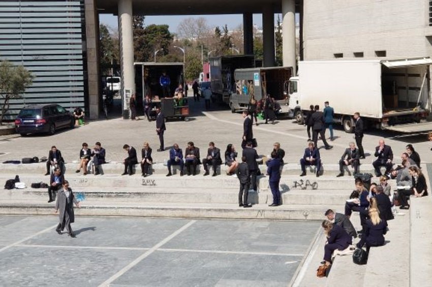 Έξω από το industrial σχεδιασμού κτίριο του δημαρχείου της Θεσσαλονίκης δεκάδες βοηθητικοί ηθοποιοί με σωματική διάπλαση και εμφάνιση που παραπέμπει στην πολυσυλλεκτική Αμερική έχουν πάρει θέσεις στο μικρό εξωτερικό αμφιθέατρο του κτιριακού συμπλέγματος για να τελειώσουν το προγραμματισμένο μεσημεριανό τους διάλειμμα για φαγητό. Με τα ομοιόμορφα μαύρα τους κοστούμια, την συντηρητική εμφάνιση στο κούρεμα και το χτένισμα, μοιάζουν με τυπικούς πράκτορες της Κεντρικής Υπηρεσία Πληροφοριών (Central Intelligence Agency – CIA) των ΗΠΑ. Λίγο πριν, είχαν παραταχθεί στις προκαθορισμένες θέσεις των γραφείων του δημαρχείου της Θεσσαλονίκης ώστε να εγγραφούν εσωτερικές σκηνές από κάποια γραφεία του δημαρχείου, που για τις ανάγκες της ταινίας, είχαν μετατραπεί σε γραφεία της CIA.