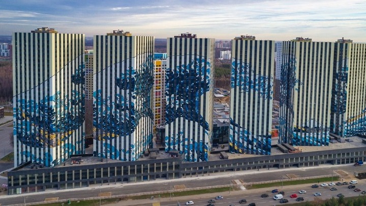 Το συναντάμε ακόμη και σε κουρτίνες μπάνιου, σε σου πλα, σε χαρτιά περιτυλίγματος δώρων, και αλλού. Τώρα, βρήκε το δρόμο για τις προσόψεις έξι κυβόσχημων ουρανοξυστών σε μια καινούργια πόλη που γεννιέται στην περιφέρεια της ρωσικής πρωτεύουσας.