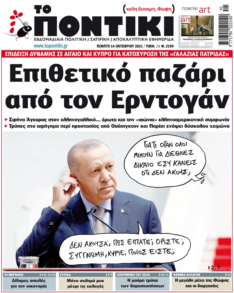 Με πρωτοσέλιδο τίτλο «Επιθετικό παζάρι από τον Ερντογάν» και αναλυτικό – αποκαλυπτικό ρεπορτάζ για την προσπάθεια της Άγκυρας να μπει «σφήνα» στον ελληνογαλλικό… έρωτα, κυκλοφορεί το «ΠΟΝΤΙΚΙ» το πρωί της Πέμπτης.