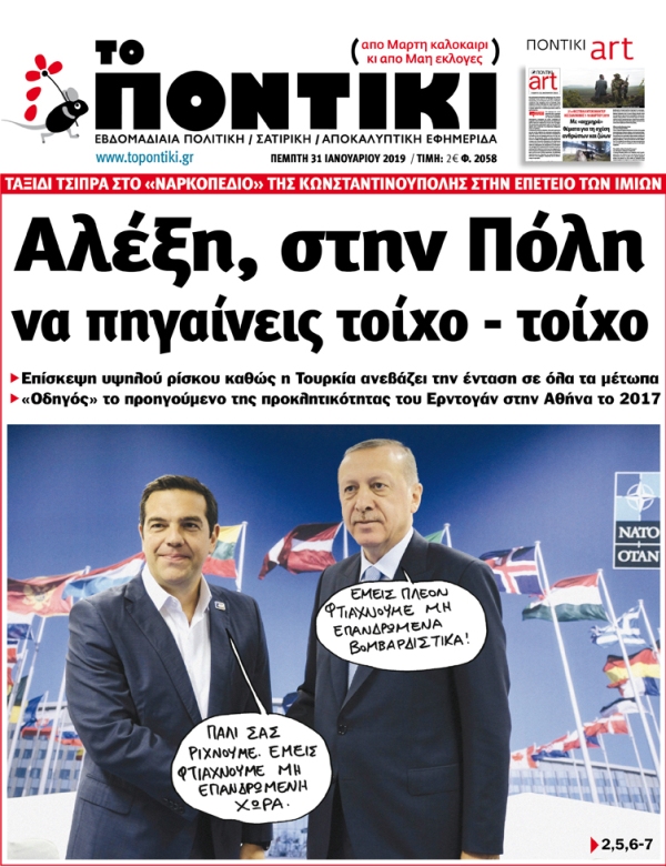 Με πρωτοσέλιδο τίτλο «Αλέξη στην Πόλη να πηγαίνεις τοίχο-τοίχο» και αναλυτικό-αποκαλυπτικό ρεπορτάζ για το ταξίδι Τσίπρα στο «ναρκοπέδιο» της Κωνσταντινούπολης την επέτειο των Ιμίων, μια επίσκεψη υψηλού ρίσκου καθώς η Τουρκία ανεβάζει την ένταση σε όλα τα μέτωπα, κυκλοφορεί το «Πoντίκι» το πρωί της Πέμπτης.