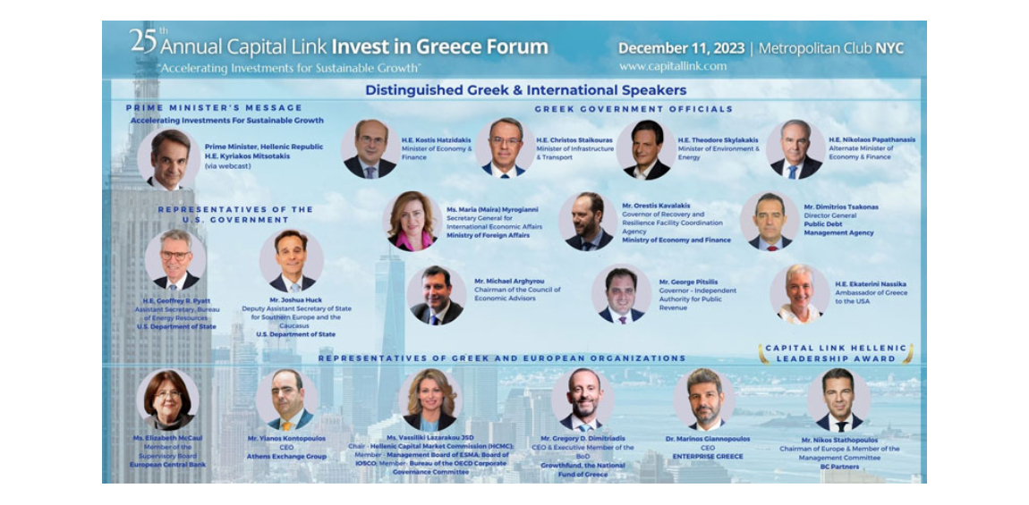 Με ιδιαίτερο ενδιαφέρον διεξάγεται σήμερα το 25ο επενδυτικό φόρουμ της Capital Link για την Ελλάδα («25th Annual Capital Link Invest in Greece New York Forum: Accelerating Investments for Sustainable Growth»), το οποίο λαμβάνει χώρα, όπως κάθε χρόνο, στον πολυχώρο Metropolitan Club, στην «καρδιά» του Μανχάταν.