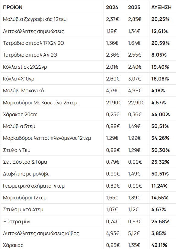Ακολουθεί ο πίνακας με τις αυξήσεις των σχολικών ειδών που δημοσιοποίησε η ΕΕΚΕ: