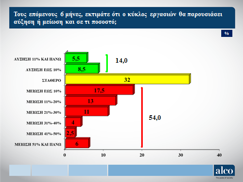 Δεύτερος άξονας, η σημαντική μείωση εσόδων το τελευταίο εξάμηνο, σε σχέση με το αντίστοιχο διάστημα του 2019. Το 80,5% δηλώνει μείωση εσόδων. Η πλειονότητα, μάλιστα, το 49,5% δηλώνει μείωση που ξεπερνά σε ποσοστό το 20%, σε σχέση με το 2019. Το 28% αναφέρει μείωση από 21% – 40%, ενώ το 21,5% αναφέρει μείωση πάνω από 41%. Η εκτίμηση για το 2020, καταλήγει σε περιορισμό της πτωτικής πορείας των εσόδων και όχι ανάκαμψη τους, αφού το 54% των επιχειρήσεων αναμένει νέα μείωση εσόδων, μικρότερη, όμως, σε σχέση με τη σημερινή.