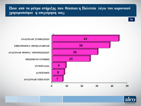 Τρίτος άξονας, η έντονη χρήση των μέτρων στήριξης που θέσπισε η Πολιτεία, από όλες τις επιχειρήσεις – μέλη του ΕΒΕΑ. Κατά μέσο όρο κάθε επιχείρηση αξιοποίησε 1,5 μέτρα στήριξης. Μεγαλύτερη χρήση είχαν η αναστολή συμβάσεων εργαζομένων (44%), η επιστρεπτέα προκαταβολή (38%), η αναστολή πληρωμής φορολογικών υποχρεώσεων (30%) και η μείωση ενοικίου (25%).
