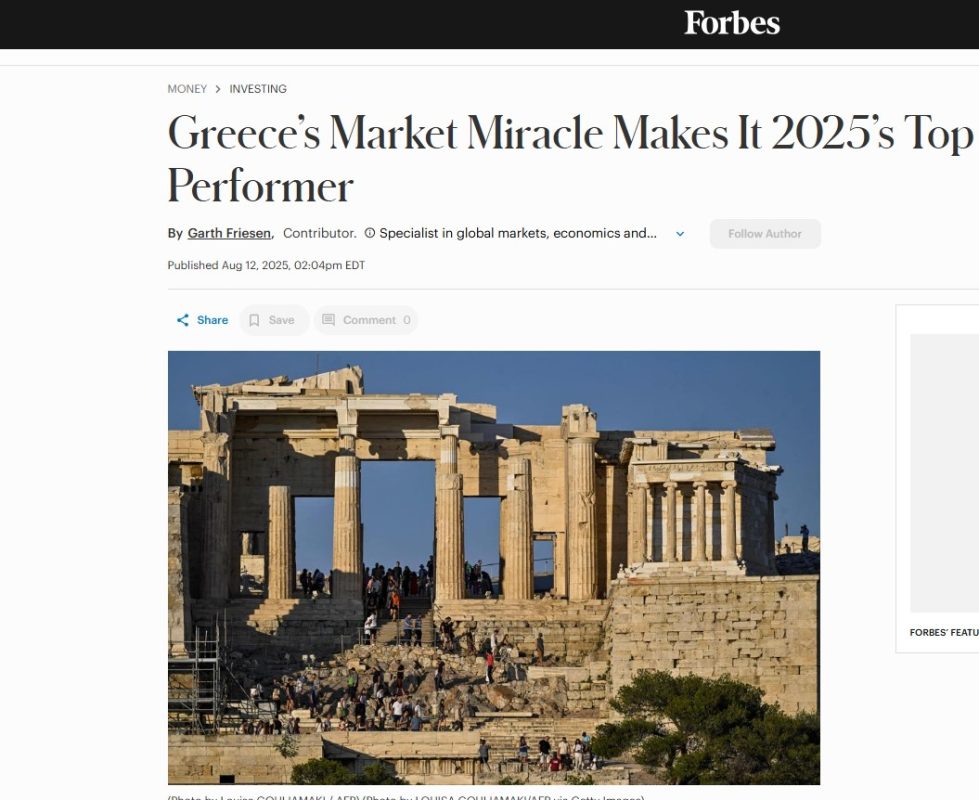 Το γνωστο οικονομικό και επιχειρηματικό περιοδικό επισημαίνει πως τα τελευταία χρόνια «η αναλογία του χρέους προς το ΑΕΠ βελτιώθηκε από 200% σε περίπου 153%, η ανεργία υποχώρησε στο 7,9% και η Ευρωπαϊκή Επιτροπή προβλέπει ανάπτυξη της τάξης του 2,3% για το 2025, σαφώς υψηλότερη από τον μέσο όρο της ευρωζώνης».
