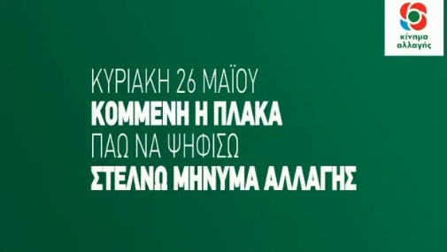 Με κεντρικό σύνθημα "Κομμένη η πλάκα. Την Κυριακή Την Κυριακή 26 Μαΐου πάω να ψηφίσω. Στέλνω μήνυμα Αλλαγής" το πρώτο σποτ του Κινήματος Αλλαγής για τις Ευρωεκλογές του Μαΐου δόθηκε στη δημοσιότητα.