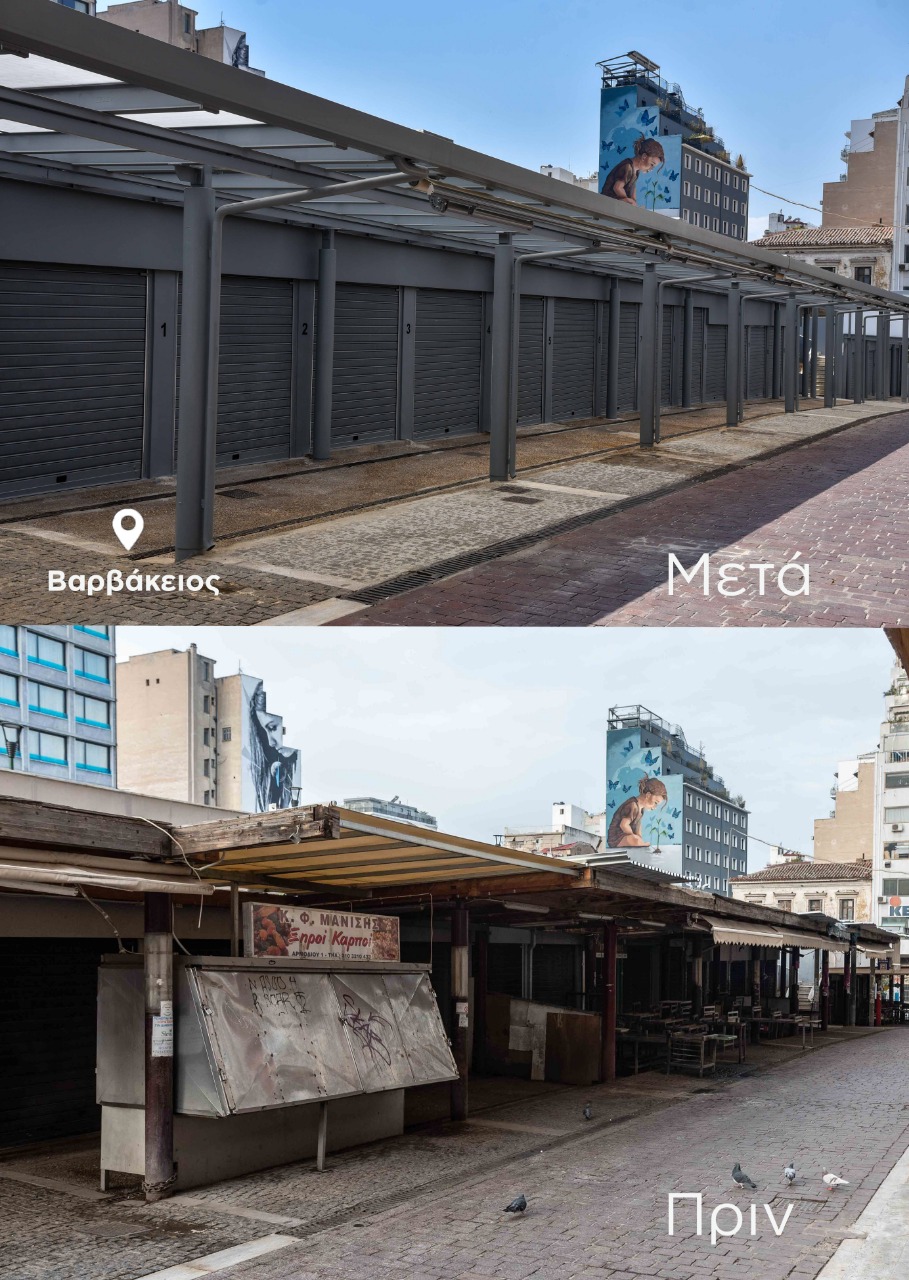 Η Δημοτική Αρχή ολοκλήρωσε την ολική ανακατασκευή των στεγάστρων και των κτιριακών υποδομών των χώρων πώλησης που βρίσκονται στην κάτω πλευρά της Βαρβακείου, αντιμετωπίζοντας τα χρόνια λειτουργικά προβλήματα που ταλαιπωρούσαν εδώ και πολλά χρόνια τους ανθρώπους που δούλευαν ή επισκέπτονταν την αγορά.