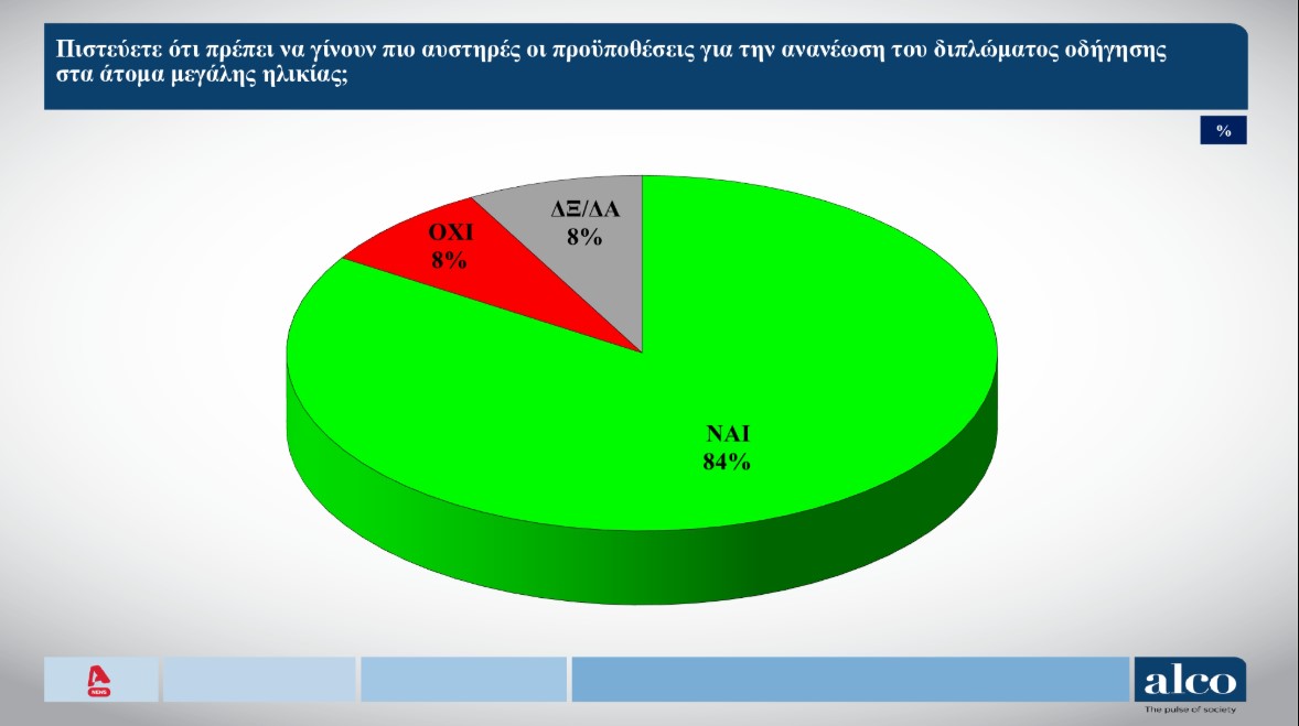 Αναλυτικά, στην ερώτηση εάν πιστεύετε ότι πρέπει να γίνουν πιο αυστηρές οι προϋποθέσεις για την ανανέωση του διπλώματος οδήγησης στα άτομα μεγάλης ηλικίας, το 84% απαντά «ναι», ενώ το 8% λέει πως «όχι».