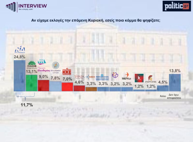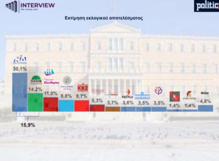 Δημοσκόπηση Interview: Προβάδισμα για τη ΝΔ, δεύτερο το ΠΑΣΟΚ