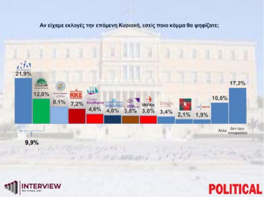 Στην ερώτηση «αν είχαμε εκλογές την επόμενη Κυριακή ποιο κόμμα θα ψηφίζατε;» οι πολίτες δίνουν 21,9% στη Νέα Δημοκρατία, 12% στο ΠΑΣΟΚ, 8,1% στην Ελληνική Λύση, 7,2% στο ΚΚΕ, 4,6% στην Πλεύση Ελευθερίας, 4% στη Φωνή Λογικής, 3,8% στο Κίνημα Δημοκρατίας, 3,8% στο ΜέΡΑ25, 3,4% στον ΣΥΡΙΖΑ, 2,1% στη Νέα Αριστερά, 1,9% στη Νίκη, 10% άλλο και 17,2% δεν έχει αποφασίσει.