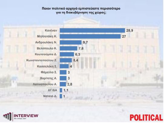 Στο ερώτημα «ποιον πολιτικό αρχηγό εμπιστεύεστε περισσότερο για τη διακυβέρνηση της χώρας;», τον Κυριάκο Μητσοτάκη απαντά το 27%, τον Νίκο Ανδρουλάκη το 9,7%, τον Κυριάκο Βελόπουλο το 7,8%, τον Δημήτρη Κουτσούμπα το 6,3%, τη Ζωή Κωνσταντοπούλου το 5,4%, τον Στέφανο Κασσελάκη το 4%, τον Σωκράτη Φάμελλο το 3%, τον Αλέξη Χαρίτση το 3%, την Αφροδίτη Λατινοπούλου το 2,8%, ΔΓ/ΔΑ το 1,1% και τον Δημήτρη Νατσιό το 1%. Ο «κανένας» συγκεντρώνει ποσοστό 28,9%.