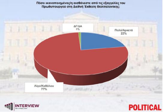 Στο ερώτημα «πόσο ικανοποιημένος/η αισθάνεστε από τις εξαγγελίες του πρωθυπουργού στη ΔΕΘ» το 77% των ερωτηθέντων δηλώνει καθόλου ή λίγο ικανοποιημένο, ενώ το 22% απαντά πως έμεινε πολύ ή αρκετά ικανοποιημένο. Το 58% απαντά πως δεν υπάρχει κάποιο μέτρο που θεωρεί πως το αφορά προσωπικά, ενώ το 40% απαντά πως υπάρχει.