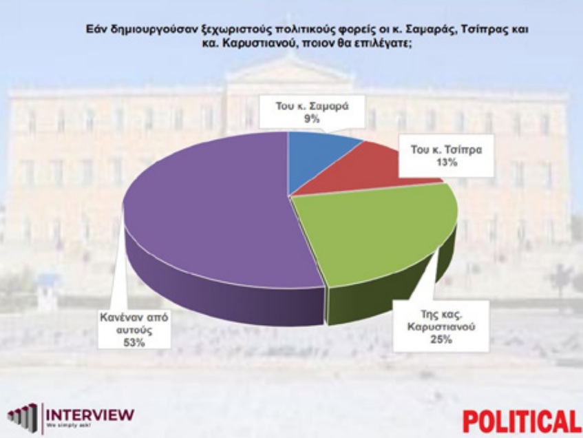 Στο ερώτημα «Εάν δημιουργούσαν ξεχωριστούς πολιτικούς φορείς οι κ. Σαμαράς, Τσίπρας και κα. Καρυστιανού, ποιον θα επιλέγατε», το 25% απάντησε της Μαρίας Καρυστιανού, έναντι 13% του Αλέξη Τσίπρα και 9% του Αντώνη Σαμαρά. «Κανέναν από αυτούς» απάντησε το 53%.