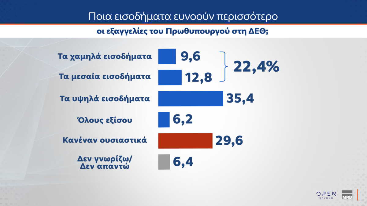 Σχετικά με την αξιολόγηση των μέτρων που ο πρωθυπουργός στη ΔΕΘ το 60,7% έχει αρνητική άποψη ως προς την αποτελεσματικότητά τους, έναντι 29,3% που βλέπει ότι τα μέτρα θα έχουν θετικό αντίκτυπο.