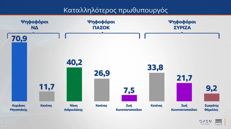 Οι ψηφοφόροι του ΠΑΣΟΚ σε ποσοστό 40,2% κρίνουν ως καταλληλότερο για πρωθυπουργό τον Νίκο Ανδρουλάκη, σε ποσοστό 26,9% τον κανένα και σε ποσοστό 7,5% τη Ζωή Κωνσταντοπούλου.