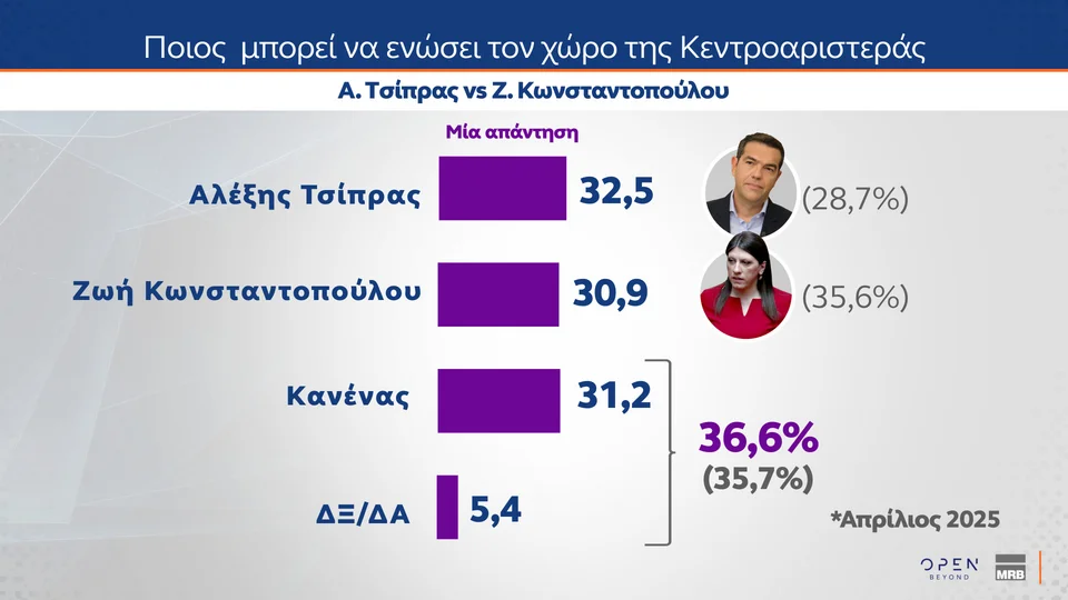 Αναφορικά με το ποιος μπορεί να ενώσει το χώρο της κεντροαριστεράς και στο δίπολο Αλέξης Τσίπρας και Ζωή Κωνσταντοπούλου, το 32,5% προτιμά τον πρώην πρωθυπουργό, ενώ το 30,9% την πρόεδρο της Πλεύσης Ελευθερίας. Το 31,2% απαντά κανένας και το 5,4% απαντά πως δεν γνωρίζει.