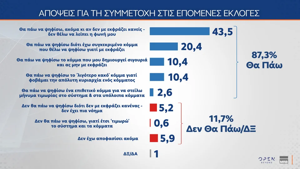 Το 43,5% απαντά πως θα πάει να ψηφίσει στις επόμενες εκλογές ακόμη και εάν δεν εκφράζεται από άλλο κόμμα, το 20,4% πως θα ψηφίσει διότι έχει συγκεκριμένο κόμμα που θέλει να στηρίξει, το 10,4% γιατί θέλει να ψηφίσει το κόμμα που του δημιουργεί σιγουριά, παρότι δεν τον εκφράζει, το 10,4% γιατί θέλει να επιλέξει το μικρότερο κακό, και το 2,6% γιατί θέλει να στηρίξει ένα επιθετικό κόμμα και να στείλει μήνυμα τιμωρίας στα υπόλοιπα.