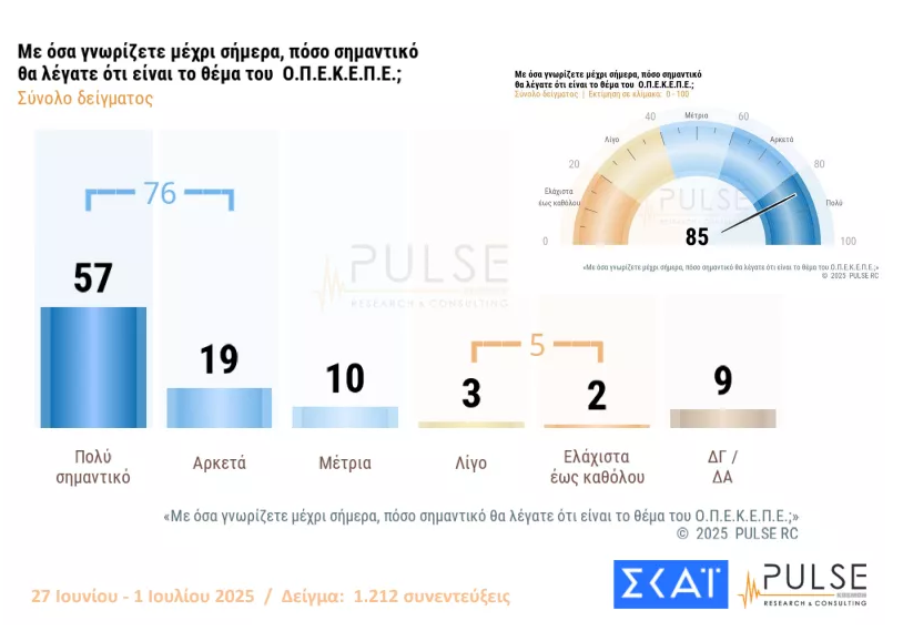 Το βασικό ερώτημα και ζήτημα στην επικαιρότητα, είναι το θέμα του ΟΠΕΚΕΠΕ. Το 76% των ερωτηθέντων δήλωσε ότι είναι πολύ ή αρκετά σημαντικό, ενώ ένα επιπλέον 10% θεωρεί το θέμα του ΟΠΕΚΕΠΕ μέτρια σημαντικό.