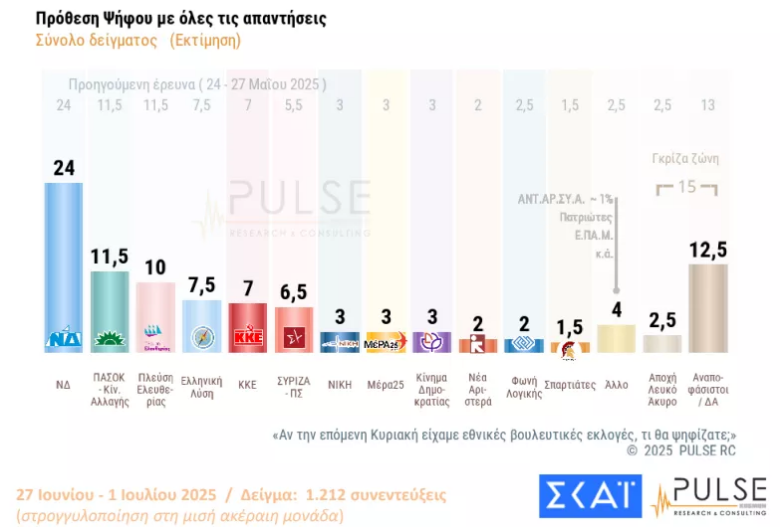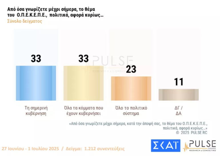 Το σκάνδαλο του ΟΠΕΚΕΠΕ και το αποτύπωμα που αφήνει στην κοινή γνώμη και στις επιλογές των ψηφοφόρων αναδεικνύει η μεγάλη δημοσκόπηση της Pulse, η οποία παρουσιάστηκε στο κεντρικό δελτίο ειδήσεων του ΣΚΑΪ. Η έρευνα διενεργήθηκε στο διάστημα από 27 Ιουνίου έως 1 Ιουλίου, σε δείγμα 1.212 ενηλίκων.