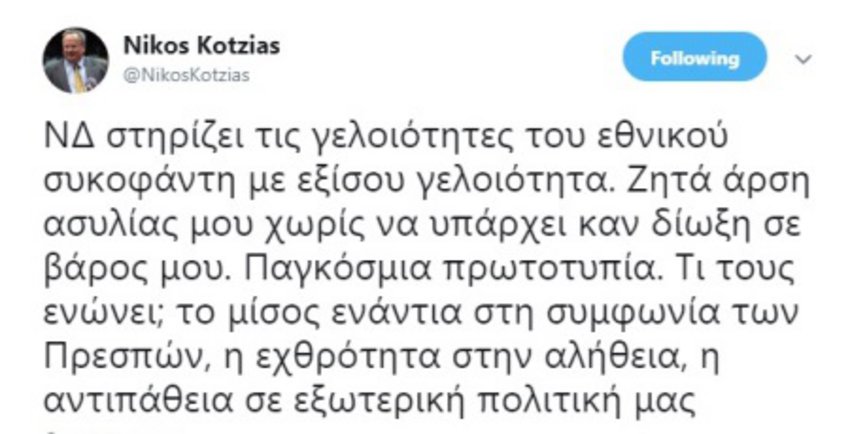 Με ανάρτησή του στο twitter, o πρώην υπουργός Εξωτερικών Νίκος Κοτζιάς εξαπολύει βολές κατά του Πάνου Καμμένου και της NΔ, αναφέροντας τα εξής: