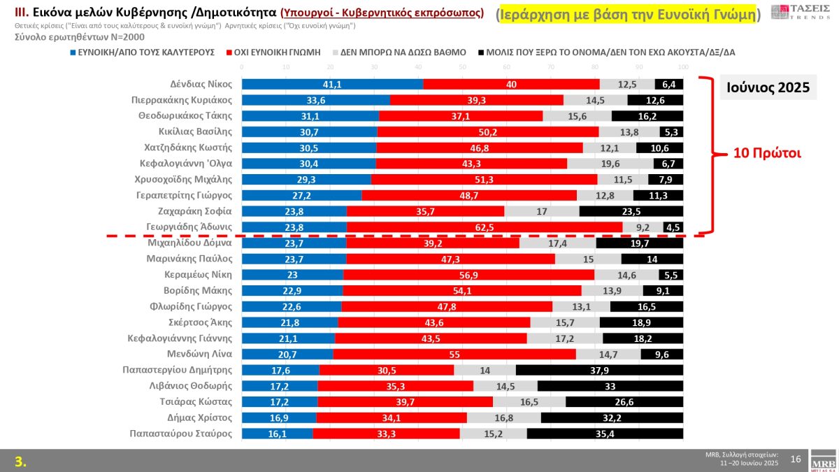 Ιδιαίτερο ενδιαφέρον παρουσιάζει η κάρτα από τις τάσεις της MRB που αναφέρεται στη δημοτικότητα υπουργών της κυβέρνησης.