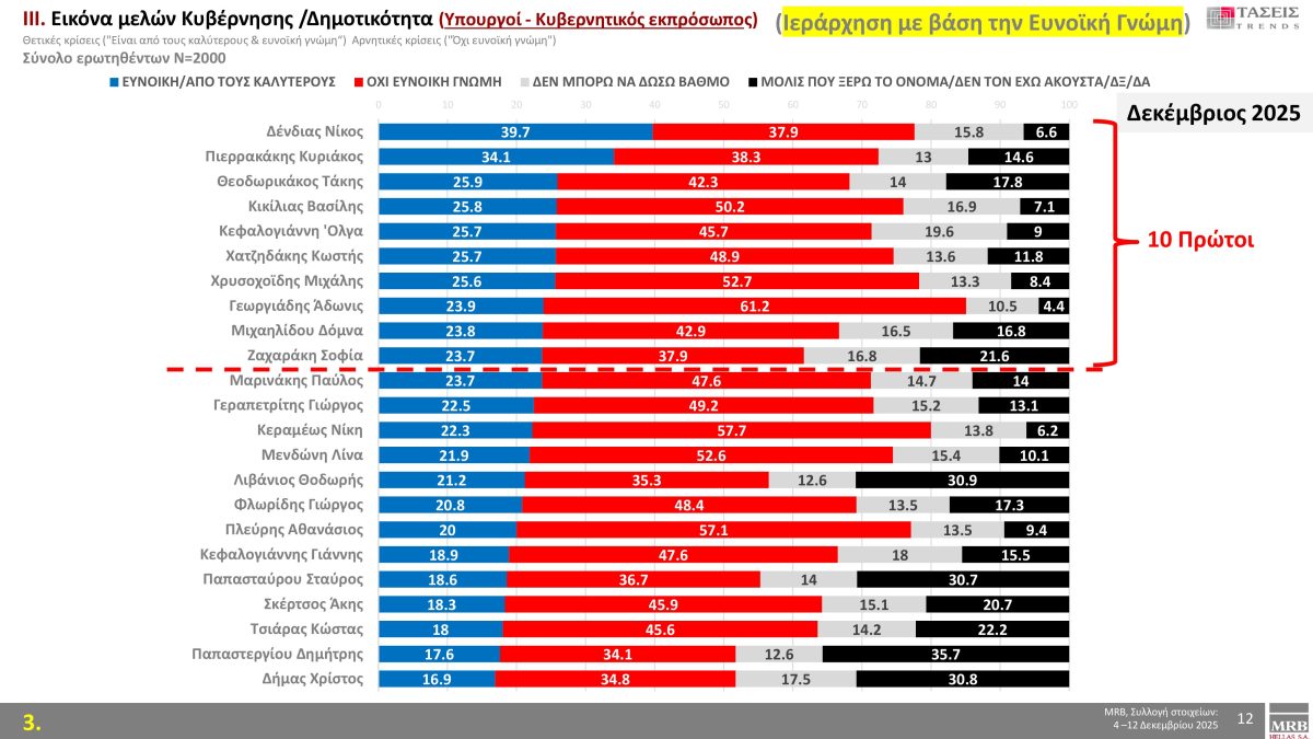 Πρώτος είναι ο υπουργός Εθνικής Άμυνας, Νίκος Δένδιας με 39,7%.