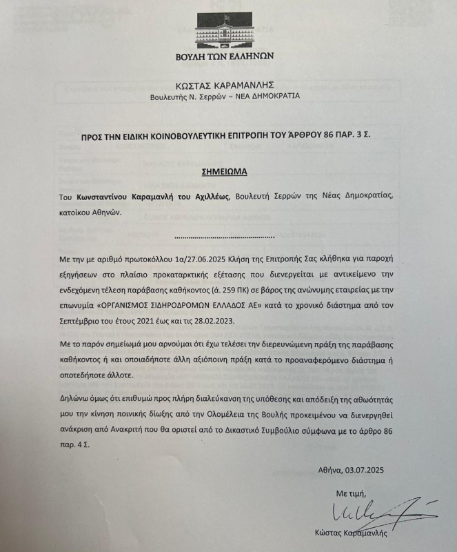 Ο κ. Καραμανλής δηλώνει ότι δεν έχει τελέσει τη διερευνώμενη πράξη της παράβασης καθήκοντος αλλά ζητά την κίνηση της ποινικής δίωξης εναντίον του προκειμένου να κριθεί από το δικαστικό συμβούλιο.