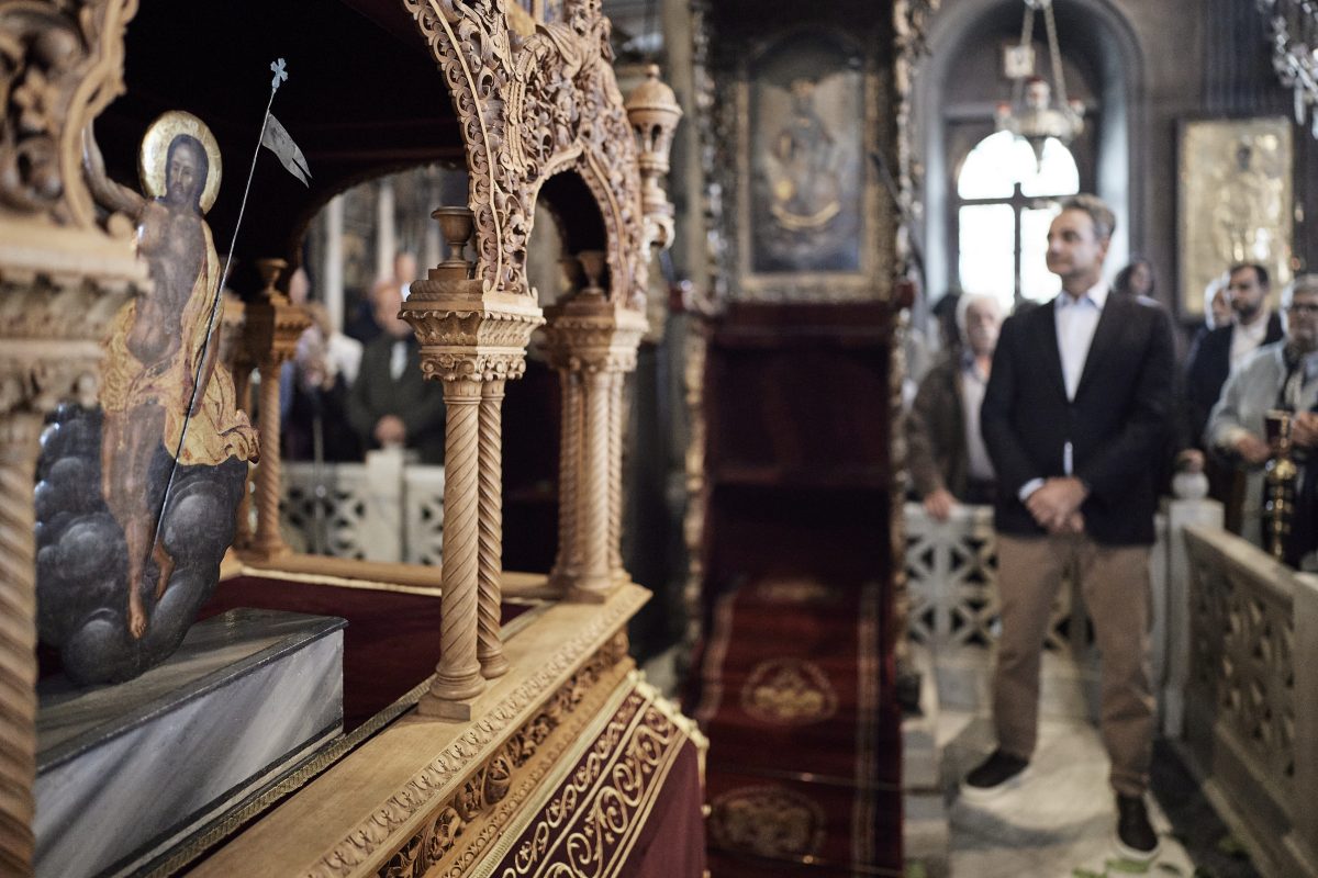 Ο Πρωθυπουργός Κυριάκος Μητσοτάκης παρακολούθησε τη Θεία Λειτουργία της πρώτης Αναστάσεως στον Ιερό Ναό Ευαγγελιστρίας Τήνου.