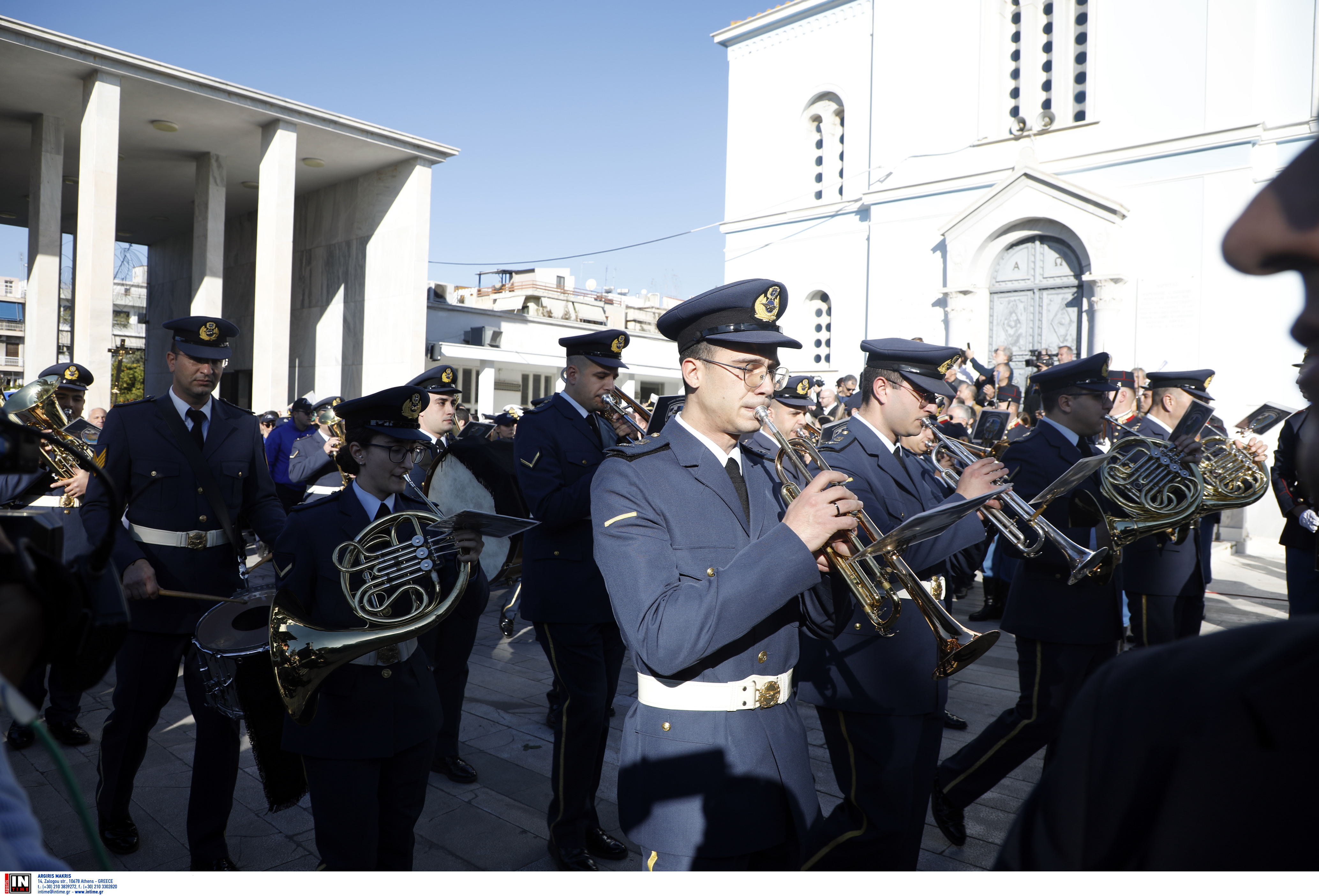 Η μπάντα του Ναυτικού παιανίζει το εμβατήριο της σημαίας κατά τον ενταφιασμό του Κώστα Σημίτη, με βάση το πρωτόκολλο της νεκρώσιμης τελετής.