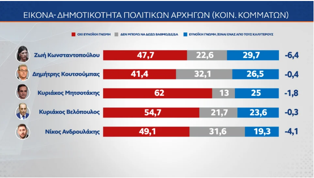 Στη δημοτικότητα των πολιτικών αρχηγών η Ζωή Κωνσταντοπούλου είναι πρώτη με 47,7% αρνητικές γνώμες και 29,7% ευνοϊκές. Ο Δημ. Κουτσούμπας ακολουθεί με 41,4% αρνητικές και 26,5% θετικές και ο Κυριάκος Μητσοτάκης με 62% αρνητικές και 25% θετικές.