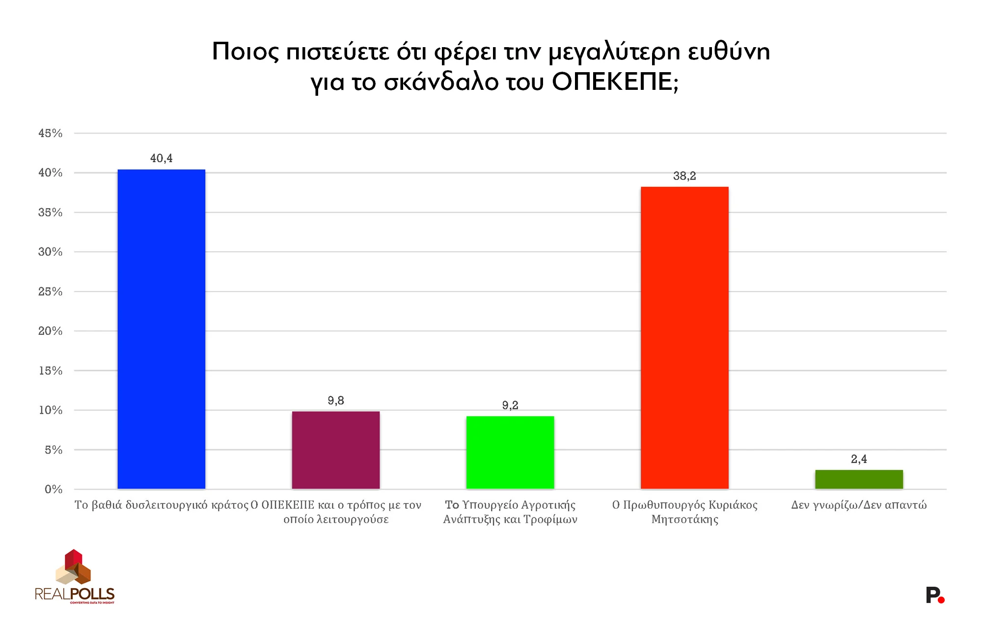 Στο ερώτημα «ποιος πιστεύετε ότι φέρει τη μεγαλύτερη ευθύνη για το σκάνδαλο του ΟΠΕΚΕΠΕ», το 40,4% απαντά «το βαθιά δυσλειτουργικό κράτος» και το 38,2% «ο πρωθυπουργός Κυριάκος Μητσοτάκης».