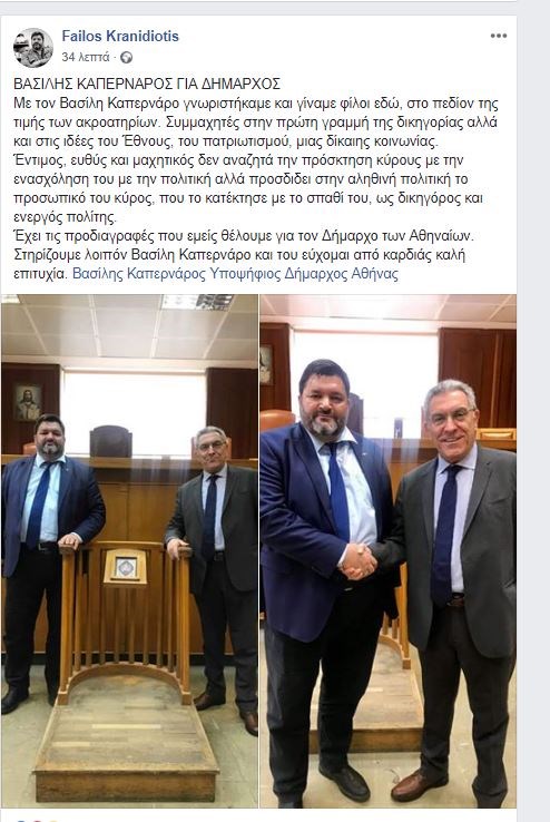 Έχει τις προδιαγραφές που εμείς θέλουμε για τον Δήμαρχο των Αθηναίων. Στηρίζουμε λοιπόν Βασίλη Καπερνάρο και του εύχομαι από καρδιάς καλή επιτυχία” αναφέρει ο κ. Κρανιδιώτης σε ανάρτησή του στο Facebook δημοσιεύοντας και δύο φωτογραφίες από τη συνάντησή του με τον υποψήφιο δήμαρχο Αθηναίων.