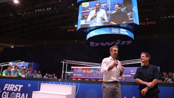 Ο Κυριάκος Μητσοτάκης, συνοδευόμενος από τον υφυπουργό Ψηφιακής Διακυβέρνησης Κωνσταντίνο Κυρανάκη, είχε την ευκαιρία να ενημερωθεί για τον διαγωνισμό «First Global Challenge» από τον ιδρυτή του Dean Kamen, να συνομιλήσει με μαθητές που διαγωνίζονται και να δει τα ρομπότ που έχουν κατασκευάσει.